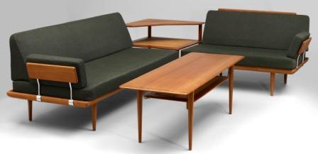 Ett komplett vardagsrumsmöblemang som utropas för 12-15 tkr. Mindre bruksslitage bara. Man får mycket för pengarna! Möbelgruppen heter Minerva och består av soffa i två delar, hörnbord samt soffbord. Träslaget är mahogny och klädseln är grön (verkar dock inte vara svår att klä om). Formgivarna heter Peter Hvidt och Orla Møllgaard Nielsen.