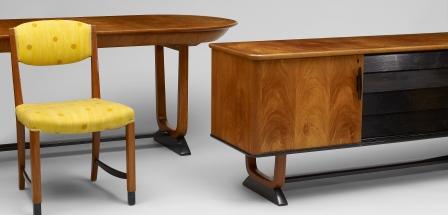 Ett matsalsmöblemang i art deco med bord , 4 stolar samt sideboard. Ser ganska fint med de svärtade detaljerna men tyget på stolarna känns ju inte som någon höjdare. Något mer strikt o sobert skulle jag ha valt. Utrop 8-10 tkr.