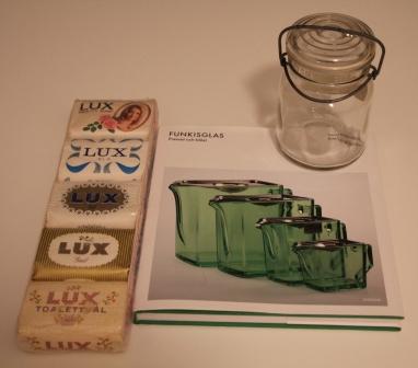 I år kom den snälla jultomten med boken Funkisglas i julklapp. Fina bilder och inspirerade text. Fick även en gammal konserveringsburk från Surte Glasbruk fylld med senapsgravad strömming. Mums. Vid sidan ligger en förpackning från 1979 med Lux tvålar. Det är en utgåva till 50 års jubiléet.Sillburken fanns nästan på bild i boken. Bokens bild är en dock en konserveringsburk från 1930-talet från Limmared. Men glasbruken snodde designer friskt från varandra.