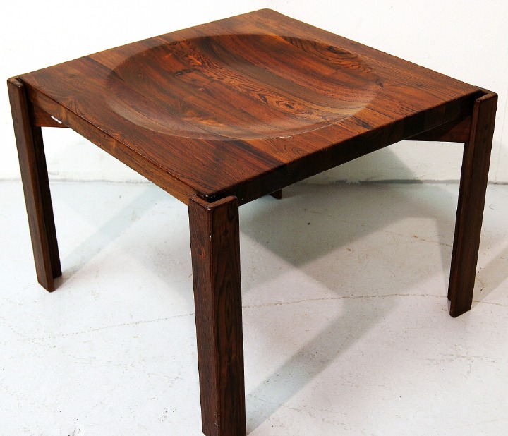Mysigt bord i massiv jakaranda som är vändbart av dansken Jens H Quistgaard. Skivan går att förvandla till vanligt bord eller fruktskål. 1960-tal. Utrop 2000 kr.