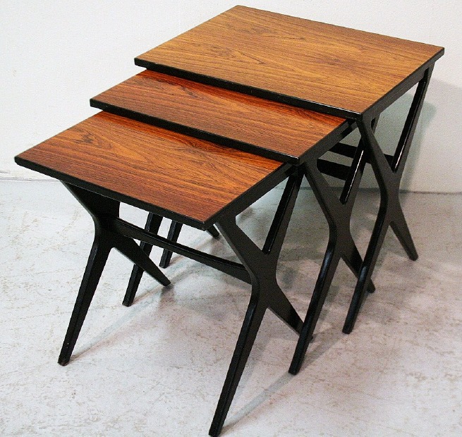Slutligen en lite mer praktisk sak. Ett 3-delat satsbord i jakaranda från 60-talet. Snyggt! Utrop 1200 kr.