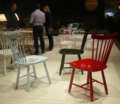 Pinnstolar på Stolab. Förr stod pinnstolar i drivor på loppisar. Inte längre.Gubi hade många fina saker i sin monter.Blå stations monter var också iögonfallande. Men många fler fanns…..