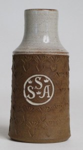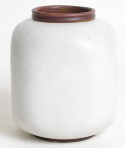 Vasen bredvid ser sober ut. Den är från Arabia. Den är från 1936 och av Kurt Ekholm. Höjden är 14 cm. Utrop 300 kr.