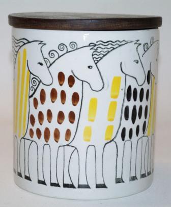 Jag har en sån lägre Gefle-burk med hästar på, tvärr är den sprucken efter en krasch i golvet…den är min favoritdekor på burkarna tror jag!