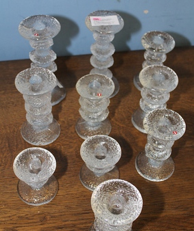 Tio Festivoljusstakar från Iittala av Timo Saarpaneva. En bra start på en samling men de högsta saknas. Höjderna är från 8 till 18 cm. (500 kr).