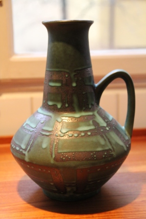 Jag köpte inget på Retromässan men som tur var råkade jag gå förbi Myrorna i morse och införskaffade denna ganska stora tyska vas (27 cm hög). Den är märkt 1507-27 W.GERM. Kanske Cinna på fantastiska bloggen Tusen Vaser vet var den kan vara tillverkad? Jag gillar i alla fall både färger och mönster!