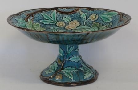 Ganska schysst fat på fot i majolika från omkring förra sekelskiftet. Absolut dekorativt. Utrop 400 kr.