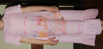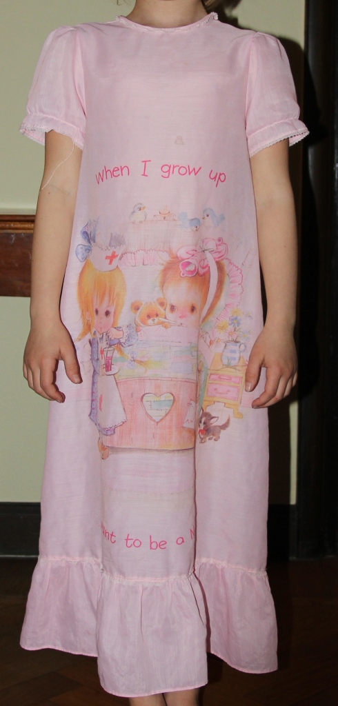 Här kommer en av döttrarna i ett retronattlinne i konstfiber. Det är svägerskans gamla och är väl från början av 70-talet. Inte helt politiskt korrekt. Ett gulligt flicknattlinne där det står When I grow up I want to be a nurse. Men dottern älskar det. Förstås. (jag också!).