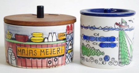 En burk från Jie Gantofta, Anita Nylunds Vår lilla stad, och en sillburk från UE Gefle. Båda dekorativa! (300 kr).