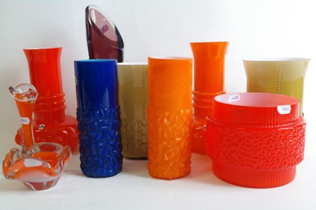 Ett gäng färgglada vaser m m från Flygsfors. Lyser upp tillvaron. Den som köper partiet kanske har lust att sälja den lilla orangea hundbensvasen till mig? Skulle passa bra i en samling jag har! (500 kr).