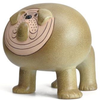 En an de figuriner Lisa Larson själv tycker bäst om i serien Kennel i maxiformat! Den runda bulldoggen. Kennel lanserades 1972 av Gustavsberg. Storleken (höjd och längd ca 30 cm) gör att buden redan ligger på 2000 kr.