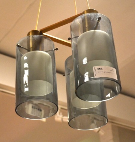 En hyfsat trevlig taklampa. Känns 60-tal. Rökfärgat glas, teak o mässing är väl aldrig helt fel.
