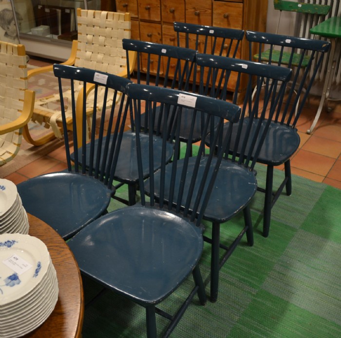 Sex pinnstolar av Carl Malmsten i mörkblått. Modellen är välkända Lilla Åland som fortfarande tillverkas och som har fått en rejäl nyrenässans i takt med att intresset för pinnstolar har ökat. Gillar man inte mörkblått så kan man ju alltid måla om dem. Det blir säkert ändå billigare än att köpa nya även om man lämnar in dem för ommålning.