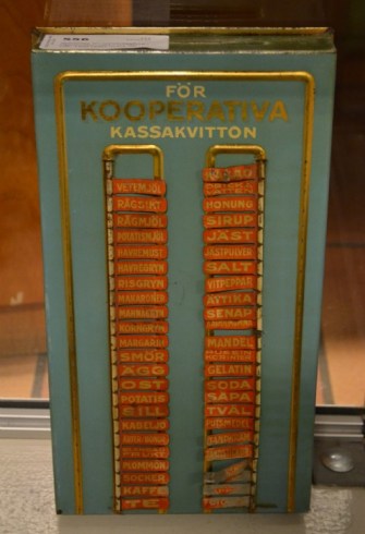 Sparbössa för konsumkvitton. Ni vet från den tiden då man sparade kvitton och själv räknade ut återbäringen vid årets slut. Det var tider det. Denna sparbössa har dessutom minnesflikar för sådant man behöver köpa hem.