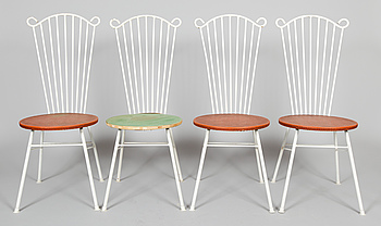 Fyra caféstolar i målad metall från 50/60-talet med grym form! Kommer från Järnums Slöjdfabrik. Någon har bjudit 700 kr (13 juli).