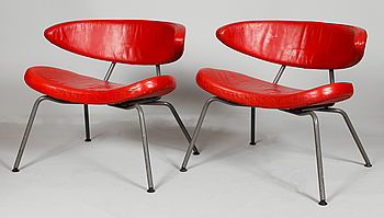 Ett par väldigt snygga fåtöljer klädda med rött skinn. Det kan vara 50/60-tal. Fett snygg form! Någon har bjudit 650 kr (15 juli).