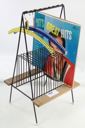 Fantastiskt snyggt skivställ. Om man råkar ha några snygga LP:s som man vill exponera. Som synes på bilden så räcker det med en snygg! Två snygga galgar på köpet! (300 kr, 29 juli)