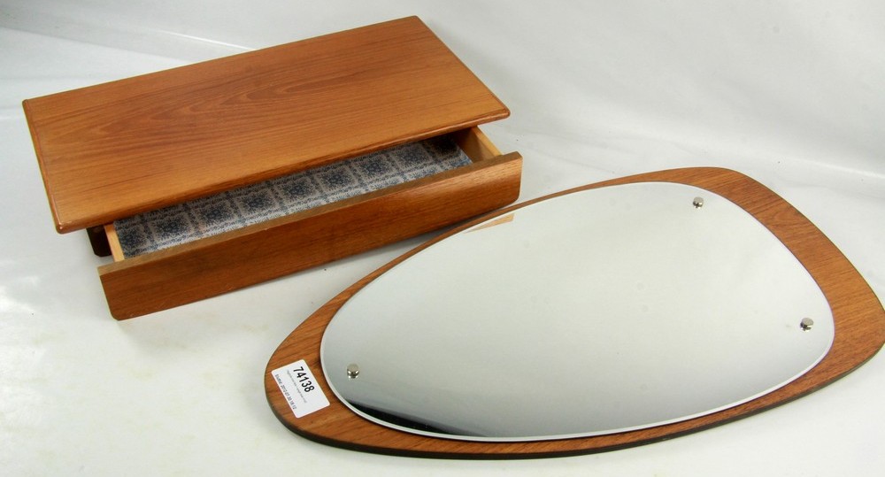 Spegel och vägglåda i teak. Kan vara snyggt i en hall. Spegelns form känns fräsch (125 kr, 30 juli).