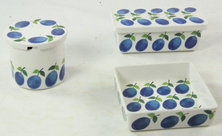 Tre väldigt snygga delar ur serien Prunus av Stig Lindberg för Gustavsberg. Bra start på en samling men det räcker även med dessa tre för att få en fin grupp! Servisen producerades mellan 1962 och 1974 men blev aldrig den storsäljare som exempelvis Berså blev. (450 kr, 1 augusti).