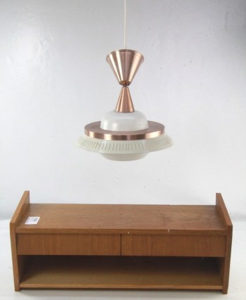 Här är en vägghylla i teak men det är inte den som drar till sig blicken utan den faktiskt rätt coola lampan ovanför. Är det någon som vet vad det är för lampa? (Inga bud lagda, 3 augusti).