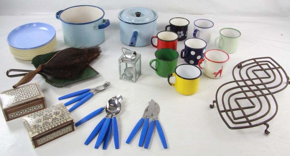 Här är det främst emaljmuggarna som är fina! Besticken är också ganska kul med sina blåa skaft. Sopskyffeln är inte dum den heller. (200 kr, 5 augusti).