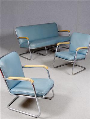 En funkissoffgrupp med stomme i förkromat stålrör och klädsel i konstskinn. Tillverkad för Aktiebolaget A.W. Nilssons Fabriker i Malmö ca 1930. Företaget, som ursprungligen hette Gustaf Nilssons korgmakeriverkstad, var ett Malmöbaserat företag som mellan 1855 – 1973 producerade bl.a. barnvagnar, korgar och stålrörsmöbler. Högsta bud 4500 kr (23 juli).