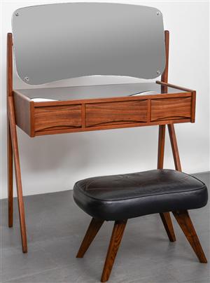 Ett sminkbord med pall i teak. Snyggt, men inte många har plats för en sådan här möbel nu för tiden. Antalet tänkbara kunder blir begränsat. Högsta bud just nu 1350 kr (23 juli).