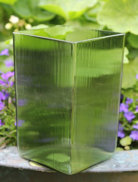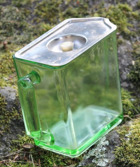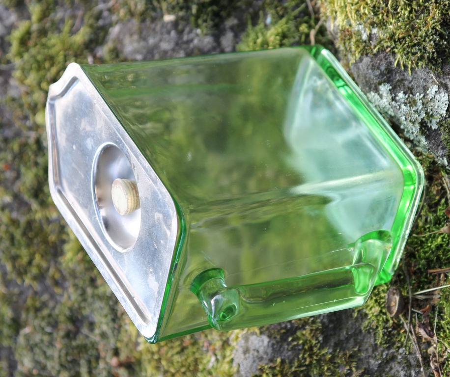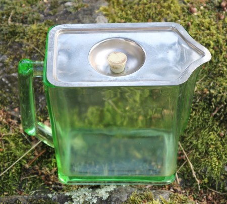 I ett kombinerat fik/antikaffär (sympatiskt) vid stora torget fyndades en kanna som passar bättre i köket hemma. Gillar den jättemycket. Dessa började tillverkas när kylskåpen kom och krävde praktiska fyrkantiga förpackningar. Är det en Kylex? Någon som vet? Tyvärr har jag inte min bok om funkisglas med mig. Kannan ser liten ut men rymmer faktiskt 1,2 liter.