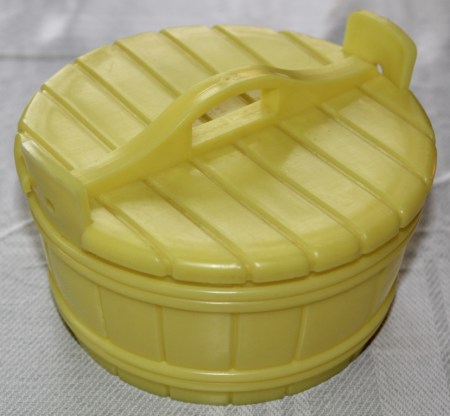 Den är tillverkad av Stockholms Plastindustri (SPI) som messmörsförpackning för Ångermanlands Mejeriförening på 50-talet. En imitation av en liten träbytta. Den var så populär att den också såldes utan innheåll på varuhusen såsom smörbytta. Den här typen av föremål bidrog starkt till plastens rykte som ersättningsmaterial utan egen karaktär. Detta var i plasttillverkningens linda. Nu har man lite svårt att förstå att den var populär. Vem vill ha en illgul träbytteliknande låda till sitt smör? Känns inte nyttigt. Eller snyggt. Men det var säkert nyhetens behag. Just detta exemplar verkar inte använt. Många smörbyttor blev nog stående i skåpen!