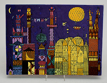 VÄGGPLATTA, fajans, Karneval, Stig Lindberg, Gustavsbergs studio.Nr 3 av en begränsad upplaga av 40 ex. Signerad och med Gustavsbergs studiohand. 24,5 x 33 cm. Så står det i katalogen. Är dock osäker på om den tillhör serien Karneval. Skulle dock gärna ha den!!!! Tyvärr har buden nått 3111 kr (26 sep).