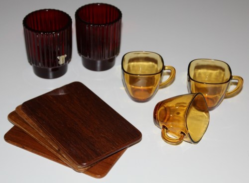 På bakluckeloppisen i Täby inhandlades tre Vereco-glöggmuggar som jag har sedan tidigare sam fyra teakunderlägg från Karl Holmberg i Götene AB. Sammanlagt pris 20 kr.