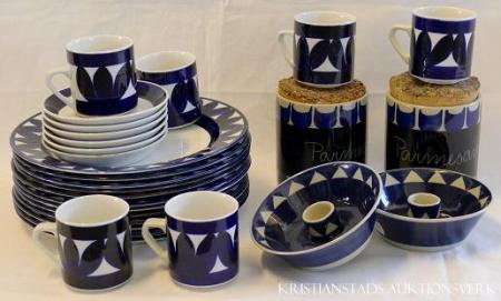 Kaffegods och mattallrikar från Arabia samt parmesanburkar och ljusstakar av Marianne Westman för Rörstrand. Passar bra ihop! Porslinet från Arabia heter Sotka och producerades mellan 1968 och 72. Designern heter Raija Uosikkinen.