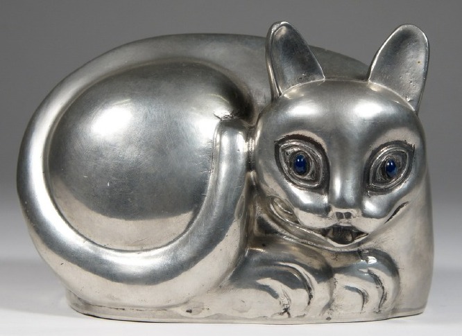 Söt katt i tenn. Från Firma Svenskt Tenn naturligtvis i design av Estrid Ericson själv. Den är tillverkad 1968. Höjden är 9,5 cm och buden uppgår för närvarande till 4400 kr. Smakar det så kostar det…….