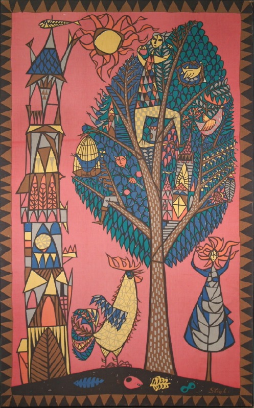 Ett helt underbart textiltryck av Stig LindbergLivets träd”, designat för Nordiska Kompaniet. Det är linneväv uppspänt på träram med måtten 220X133 cm. Hade definitivt varit spekulant om det varit något mindre.  Om man har stora ytor att fylla är det ju ett fantastiskt konstverk för relativt liten peng. Högsta bud just nu 1200 kr.