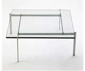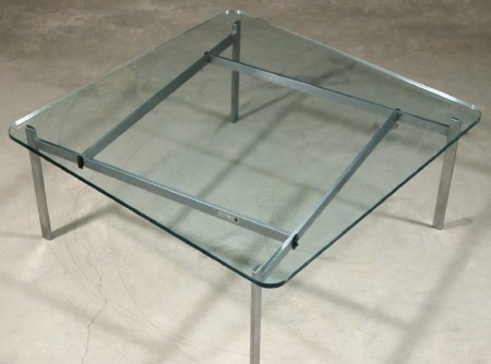 Snyggt soffbordsunderrede PK-61 av  Poul Kjaerholm är tillverkat hos Fritz Hansen. Glasskivan är inte original utan det ska se ut som på bilden nedan. Men det ska väl inte vara så svårt att göra en ny. Benen ska liksom vara utanför glaset. H33, 85×85 cm.  Buden ligger för närvarande på 3000 kr.