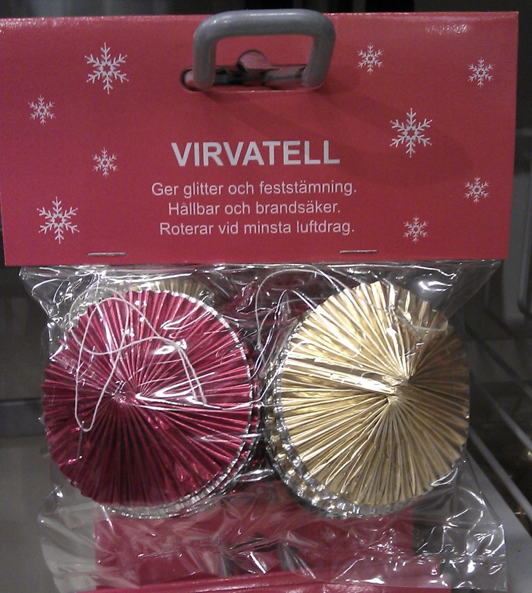 Ni vet såna där saker som hänger som skruvar i fönstren. Skimrar fantastiskt i ljusskenet. Stämningsfullt. Pris 24.90. Förresten kallas de något särskilt? Virvatell låter nypåfunnet.
