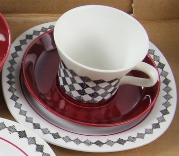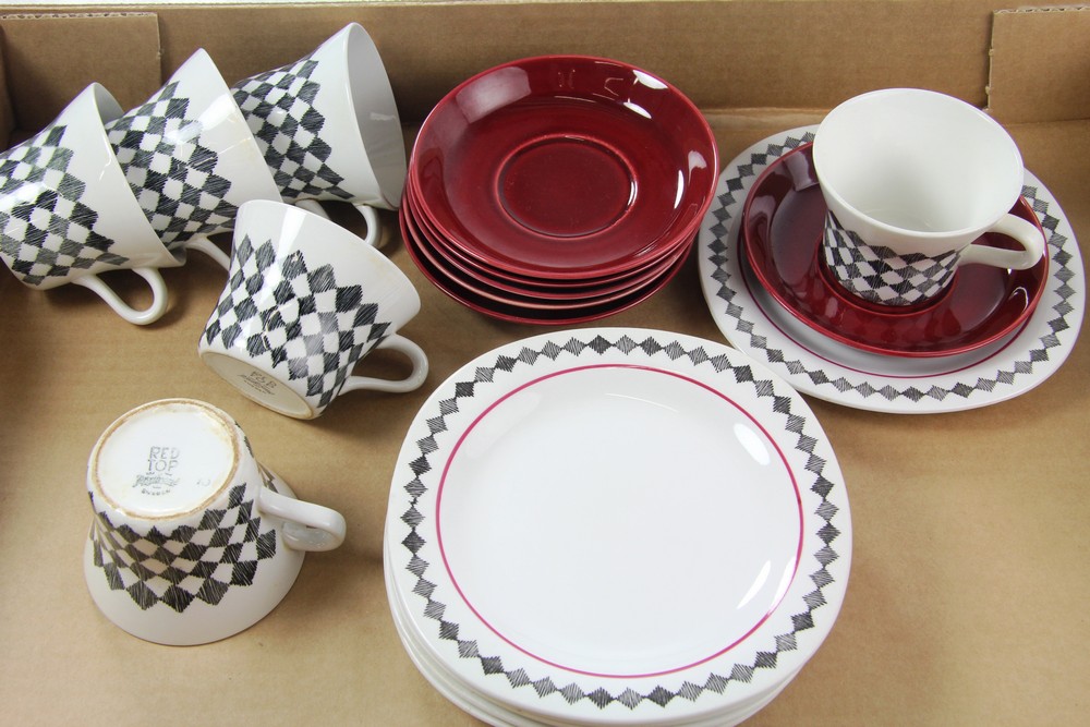 Väldigt snygg kaffeservis för 6 personer! Gillar det mörkröda kaffefatet till de tuffa kaffekopparna och assietterna. Servisen heter Red Top och är från Rörstrand. Den tillverkades 1956-67 och den är designad av Marianne Westman.