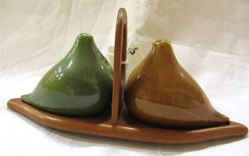 Ovanligt kryddställ. Salt – och pepparströare i form av pippifåglar i ett ställ av teak.