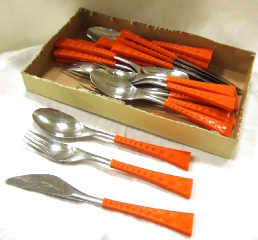 Speciella bestick designade av Nanny Still för Hackmann. Hon är ju mest känd för sina glasdesigner. Besticken heter iallafall Colorina och de finns med röda, gröna och blå skaft också. I alla fall i Finland får man betala en bra slant för dessa!