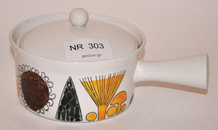 En karott från Rörstrand dekorerad med svampar rund om. Påminner mycket om Picknick. Den här servisen heter dock Stuva och jag utgår ifrån att den är av Marianne Westman. Snygg men tycker personligen att det är otympligt att förvara denna typ av karotter med ett handtag som sticker ut. Inte heller här har budgivningen kommit igång.