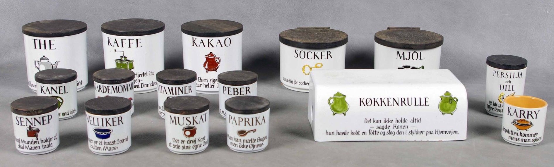 Många samlar på dessa danska kryddburkar. Inte min stil direkt men lite roliga är de ju. Här får man hela 16 delar inkl pappershållare. Ingen har börjat bjuda än men man har tid på sig då auktionen avslutas 9 maj. Burkarna är i porslin med trälock. Serien tillverkades både med dansk och svensk text. Här är en blandning men det är väl bara charmigare??!