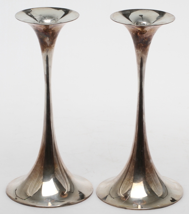 Gillar den strutiga formen på dessa ljusstakar. De är från England och i sterlingsilver. De kan ju bli helvassa efter en omgång med putstrasan. Högsta bud just nu 1000 kr (4 maj).