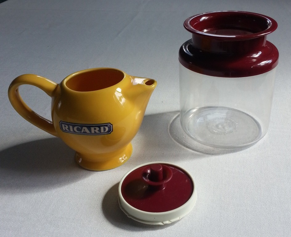 En liten kanna för vatten. Ricard är en typ av pastis med ursprung från Marseille som började tillverkas 1932 av Paul Ricard. Ricard utvecklades som en ersättningsdryck till absint enligt Wikipedia. Kannan kostade en guldpeng.