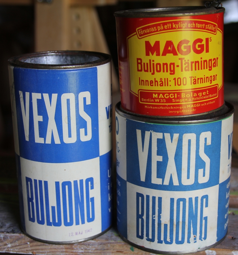 Allehanda buljongburkar. Släkten som ägde huset före oss drev lanthandel på 40/50-talet. Burkarna måste komma därifrån antar jag. På den vänstra höga burken står 12 maj 1947.