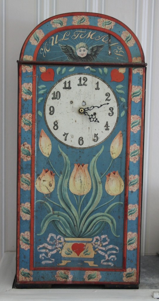 Alla mina bilder ser ut att luta idag. Men det är bilderna, inte föremålen! Den här plåtburken stod i vår stuga när vi köpte den. Lite solblekt och utan urverk. Ett nytt urverk fixades raskt från Clas Ohlsson.