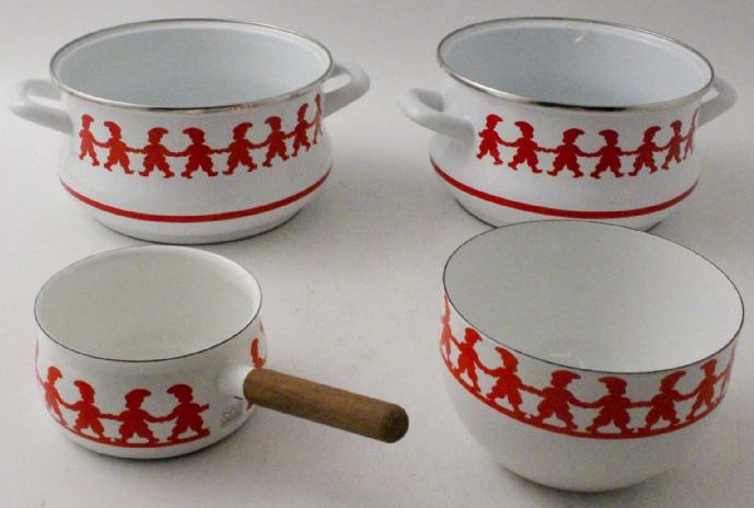 Så här står det i katalogen KAROTTER 4 delar, bland annat, Arabia, julmotiv. Vad jag undrar över är detta ”bland annat”. Vad är bland annat? Vore kul om de istället skrev att det är Tonttu från Arabia, emalj, kastrull med teakhandtag, design Kaj Franck. Om det nu är så. Det senare är vad jag har kunna finna på nätet. Buden har nått 350 kr.