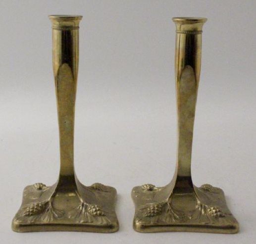 Väldigt snygga jugendljustakar i mässing. Höjden är 20 cm. Man blir lite sugen på att putsa dem bara! Budnivå: 500 kr.