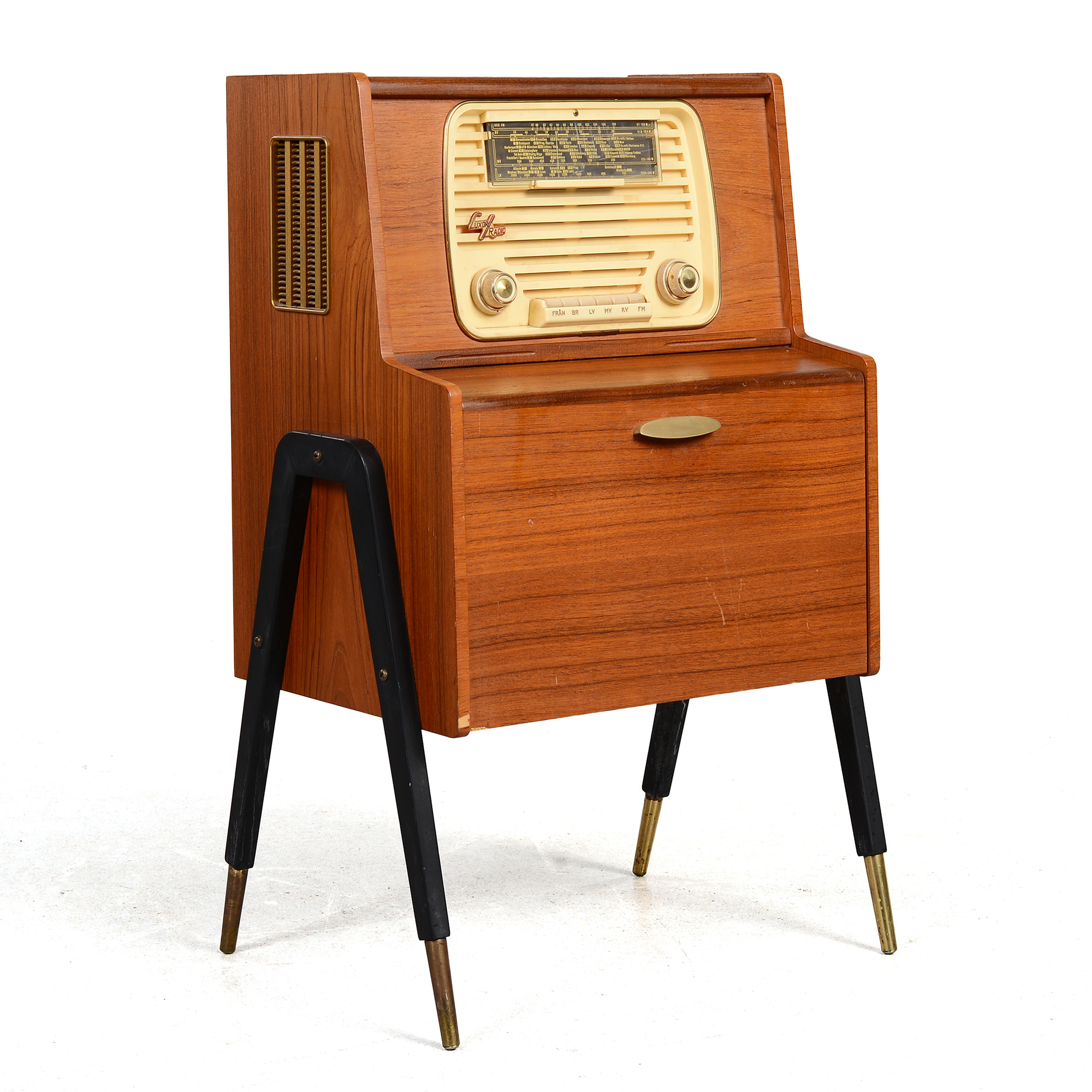 Slutligen en tjusig rediogrammofon i teak för den som har plats. Det är en Luxorett från Luxor. Skivspelaren finns bakom klaffen. Den är förstås ”ej funktionstestad”. Budnivån har nått 400 kr.