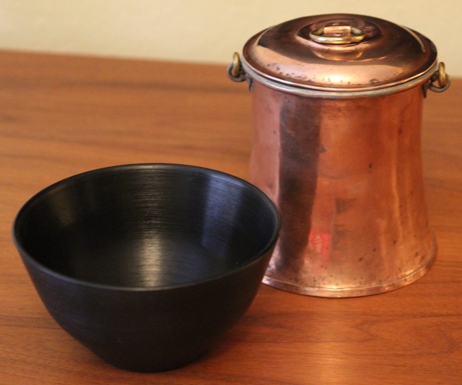 Bild 010En skål i hårdplast av Sigvard Bernadotte. Som ny efter lite inoljning! Kunde inte låta bli kopparburken heller! Så billig att den får stå på tillväxt tills kopparn har slagit igenom på allvar! Har dock svårt att se om den är gammal eller inte. Den är handgjord tror jag men när kopparn var som hetast på 70-talet så gjordes nya grejer som skulle se gamla ut. Antikförfalskare har funnits i alla tider!