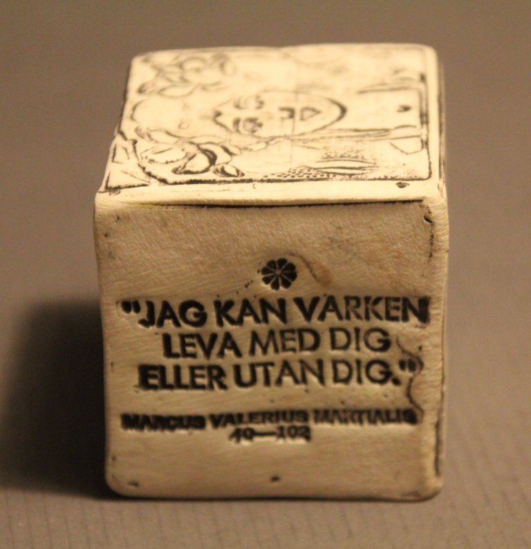 Kultstenar i benporslin. Finns i flera modeller, tex. Direktörsstenen, lämplig som gåva till personer som är eller uppträder som direktörer, Kärleks-och Lyckostenen till förlovade och andra lyckliga, Skepparstenen till båtälskaren, De vises sten för bra betyg eller examen, Dagstenen till alla. 24:-